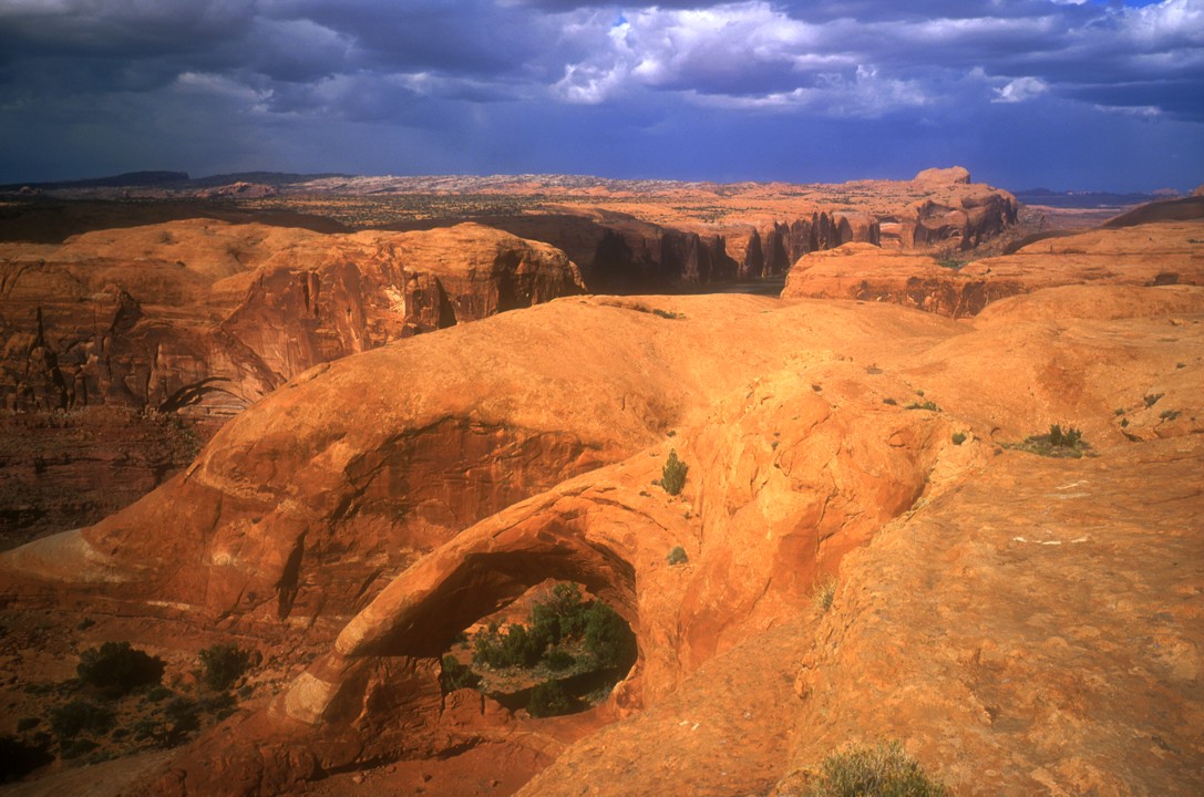 The slickrock above Kane Creek and a hidden arch and the Colorado River in the background; we ascended a steel cable on the ramp just beyond the arch