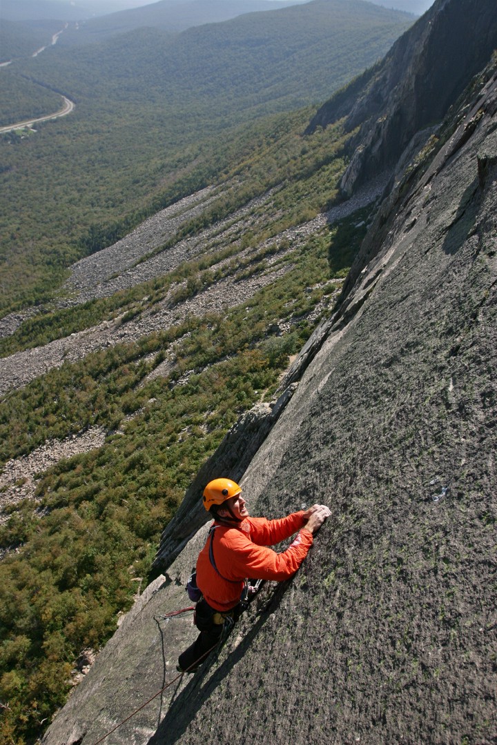 Climbing the slab below the overlap on the 5th pitch