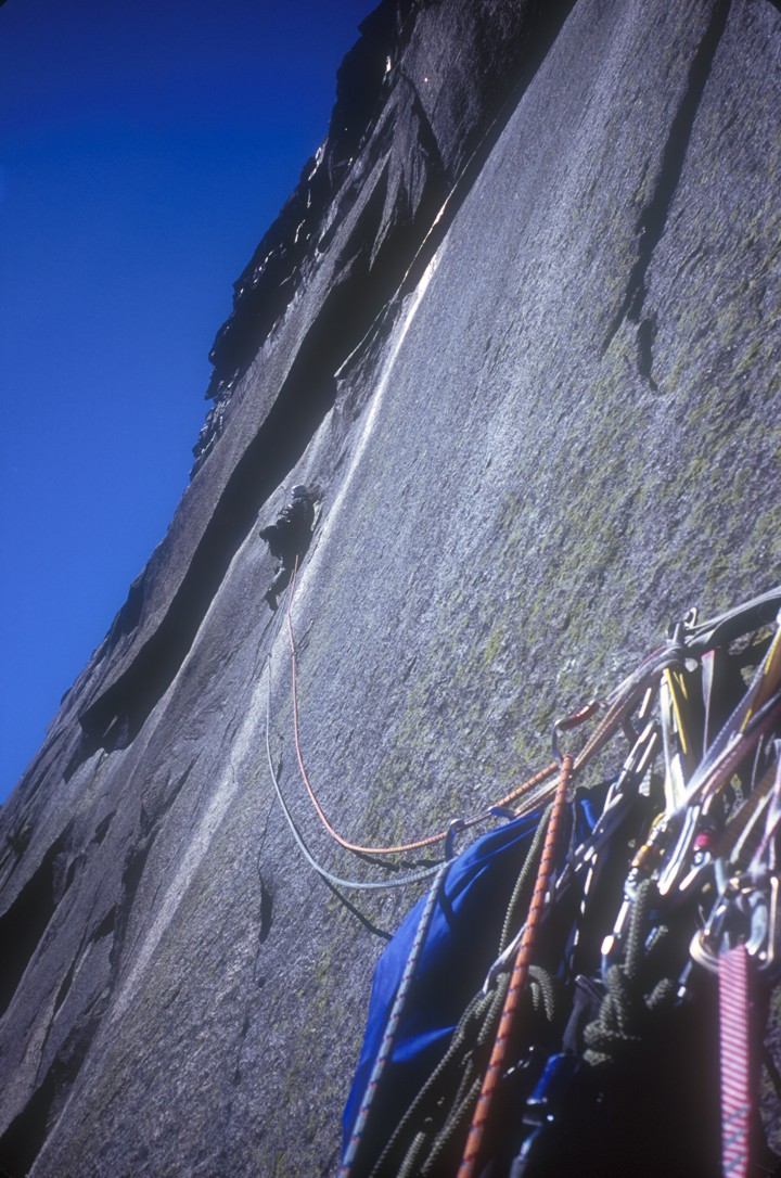 At the end of the traverse on the 4th pitch, a couple of really hard moves (5.11c) take Bones to overlap. This pitch is a variation to the original route that avoids the 5.11d A3 section.