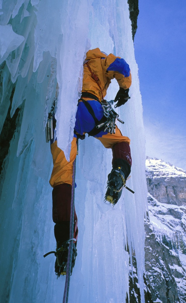 Jim on the crux column at the start of the second pitch of Bridalveil Falls