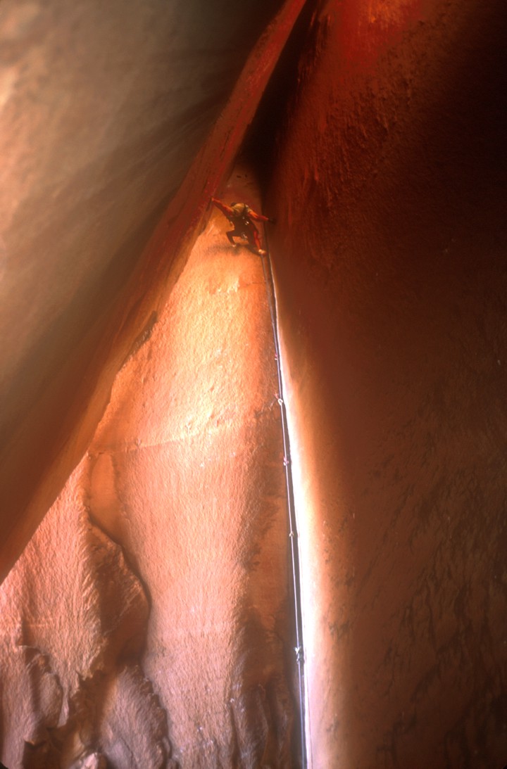 Near the top of the crack Colin finally gets a rest by stemming to the opposite wall