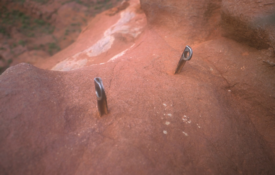 Pitons on the "sidewalk" belay; the rock around the drilled pitons has eroded