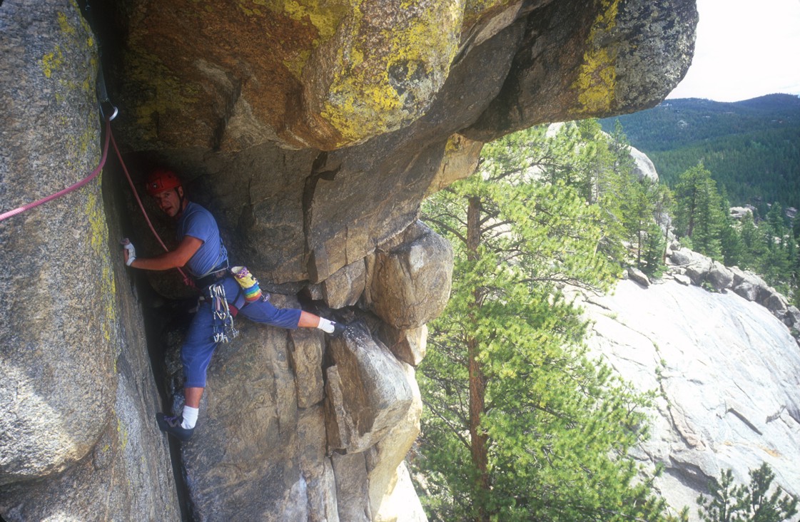 Once high in the corner, Nikos moves leftwards through the roof to the belay station