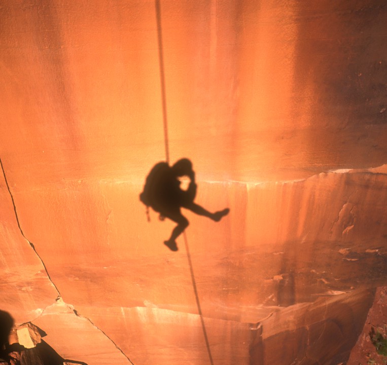 Jim's shadow on Sunflower Tower as he raps from Easter Island