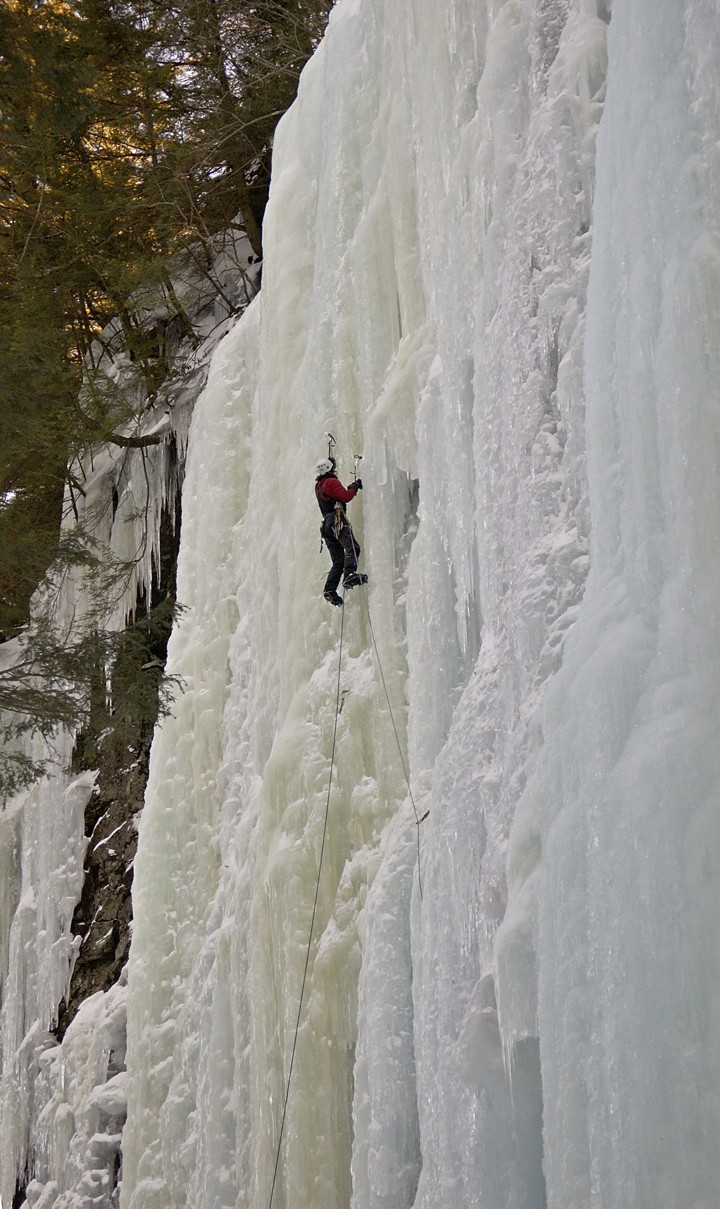 Climbing the upper ice above the window; the route "The Advocate" is the yellow column to his left