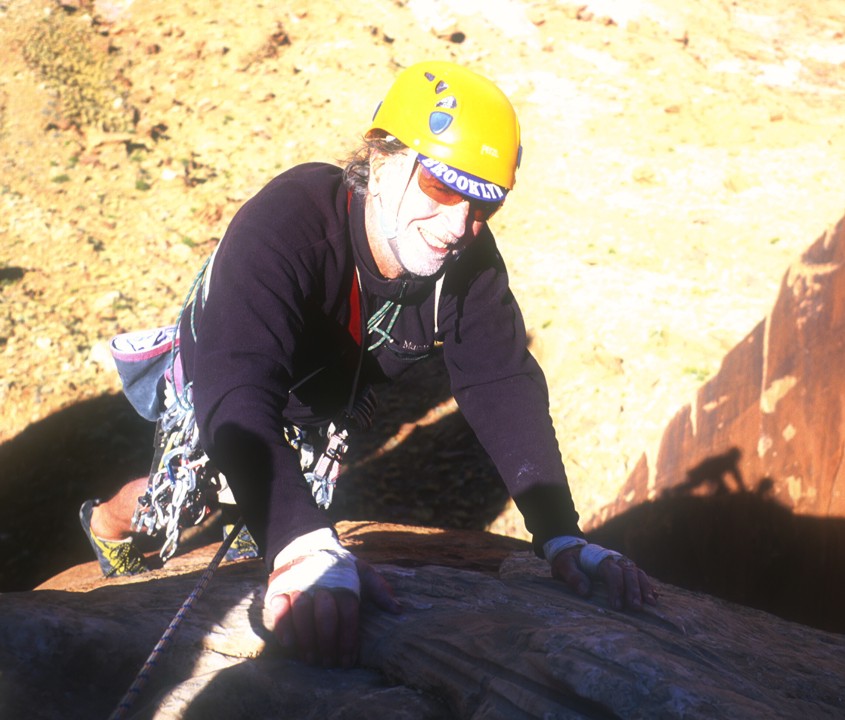 John tops out on Thunderbolts, a rare face climb at the Creek