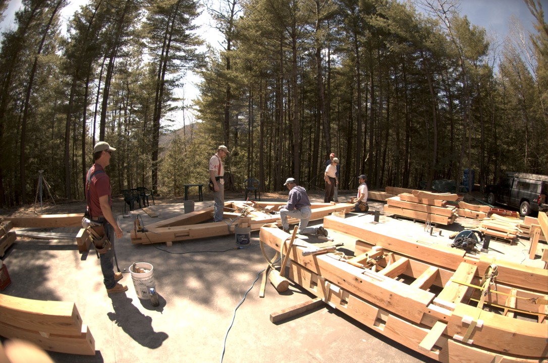 The crew getting started with the raising; Steve is dealing with an issue where the iron rods in the foundation are mispositioned